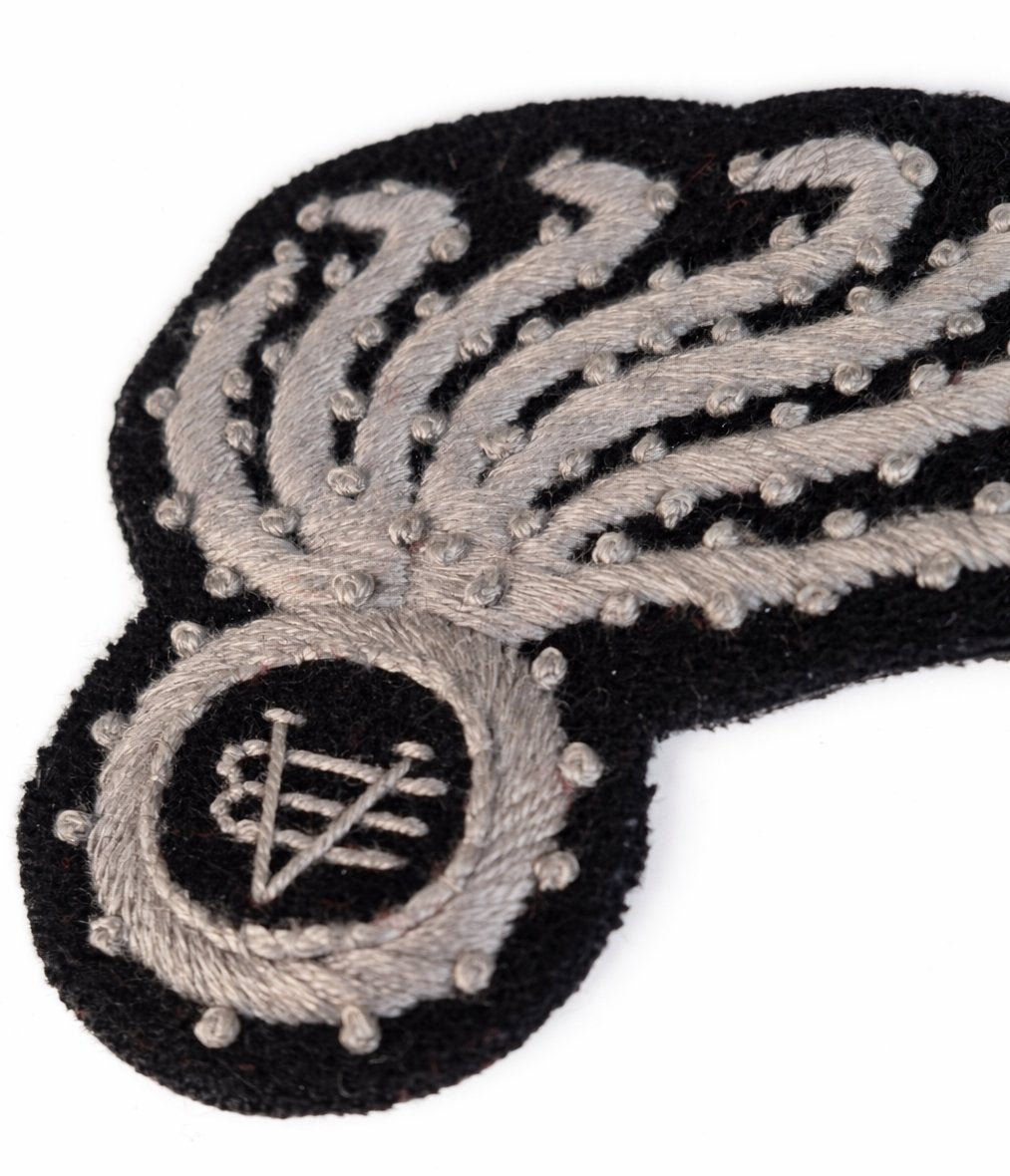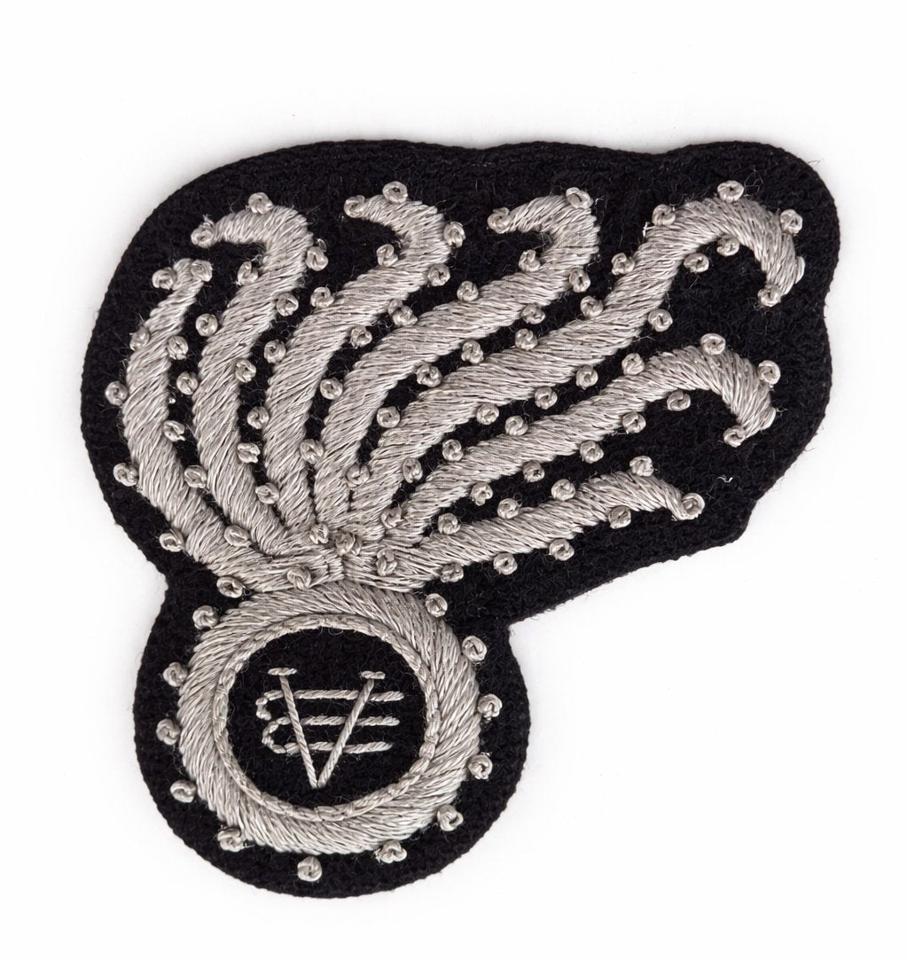 La lavorazione artigianale valorizza il disegno ornamentale tipico dei fregi dell'epoca, caratterizzato da elementi decorativi ricamati e dal simbolo distintivo dell'Arma inserito nel medaglione centrale.