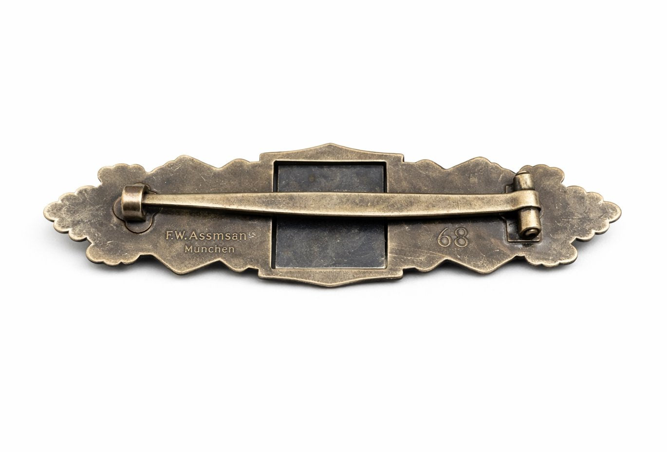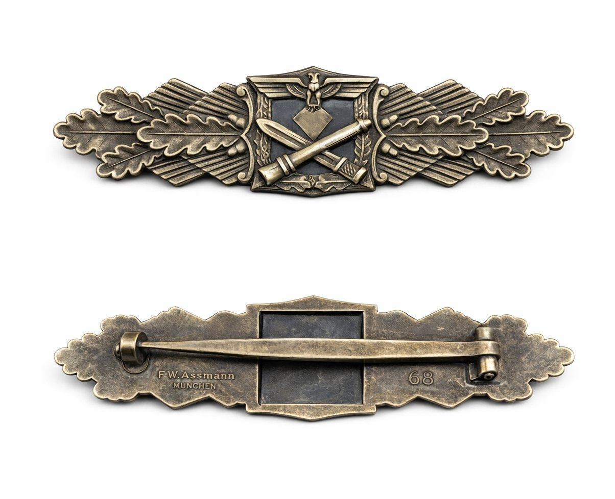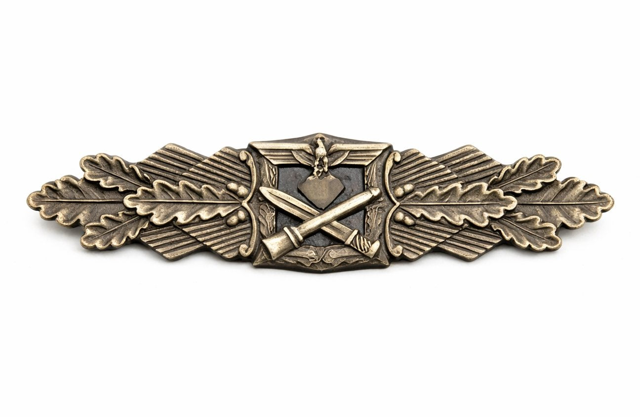 Riproduzione fedele del Distintivo per Combattimenti Ravvicinati in classe Bronzo (in tedesco Nahkampfspange), decorazione istituita il 25 novembre 1942 e conferita ai militari impegnati in azioni di combattimento ravvicinato.