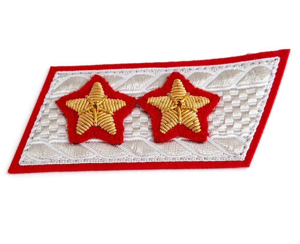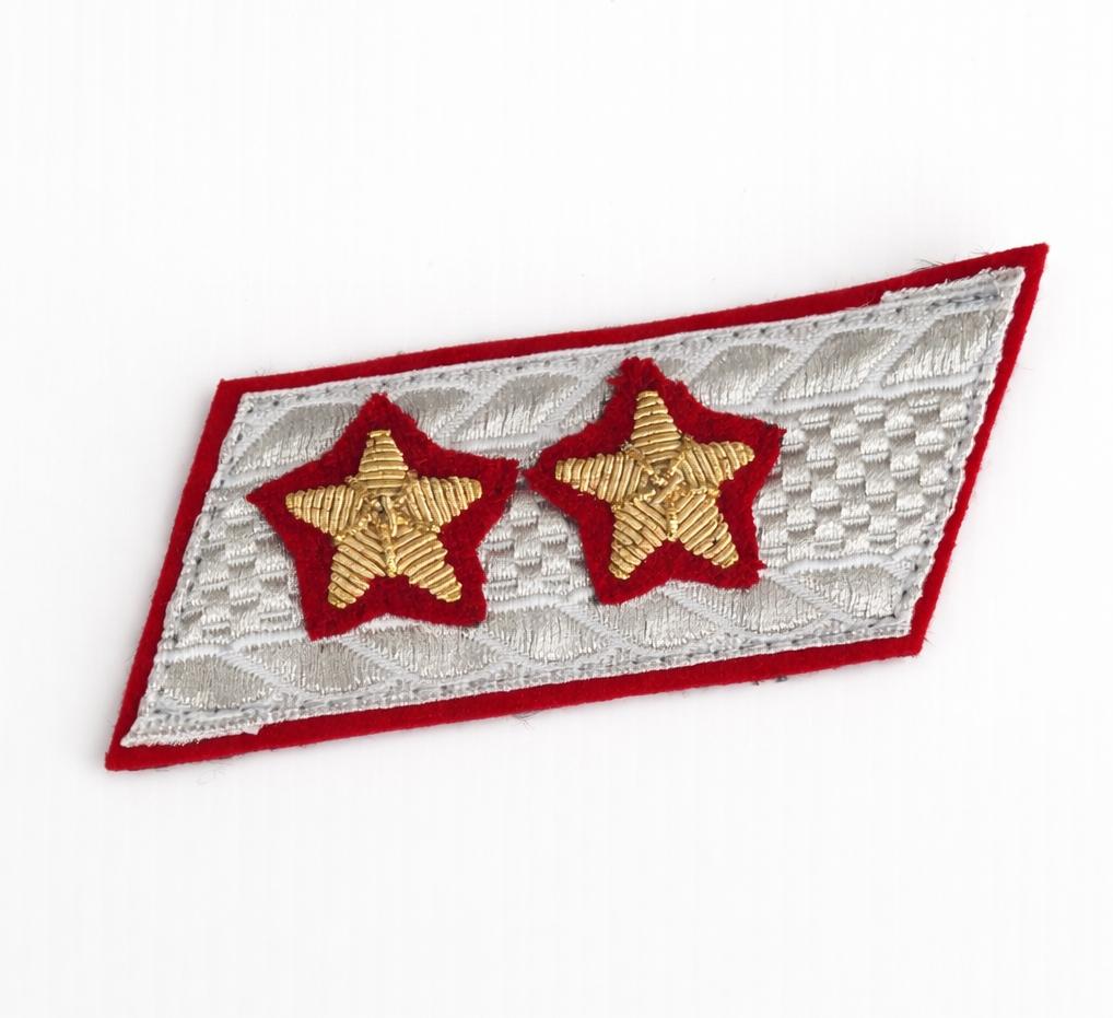 Il distintivo, composto da due stelle dorate, identificava il rango di Generale di Divisione, uno dei più alti gradi operativi dellesercito italiano nel periodo 19401943.