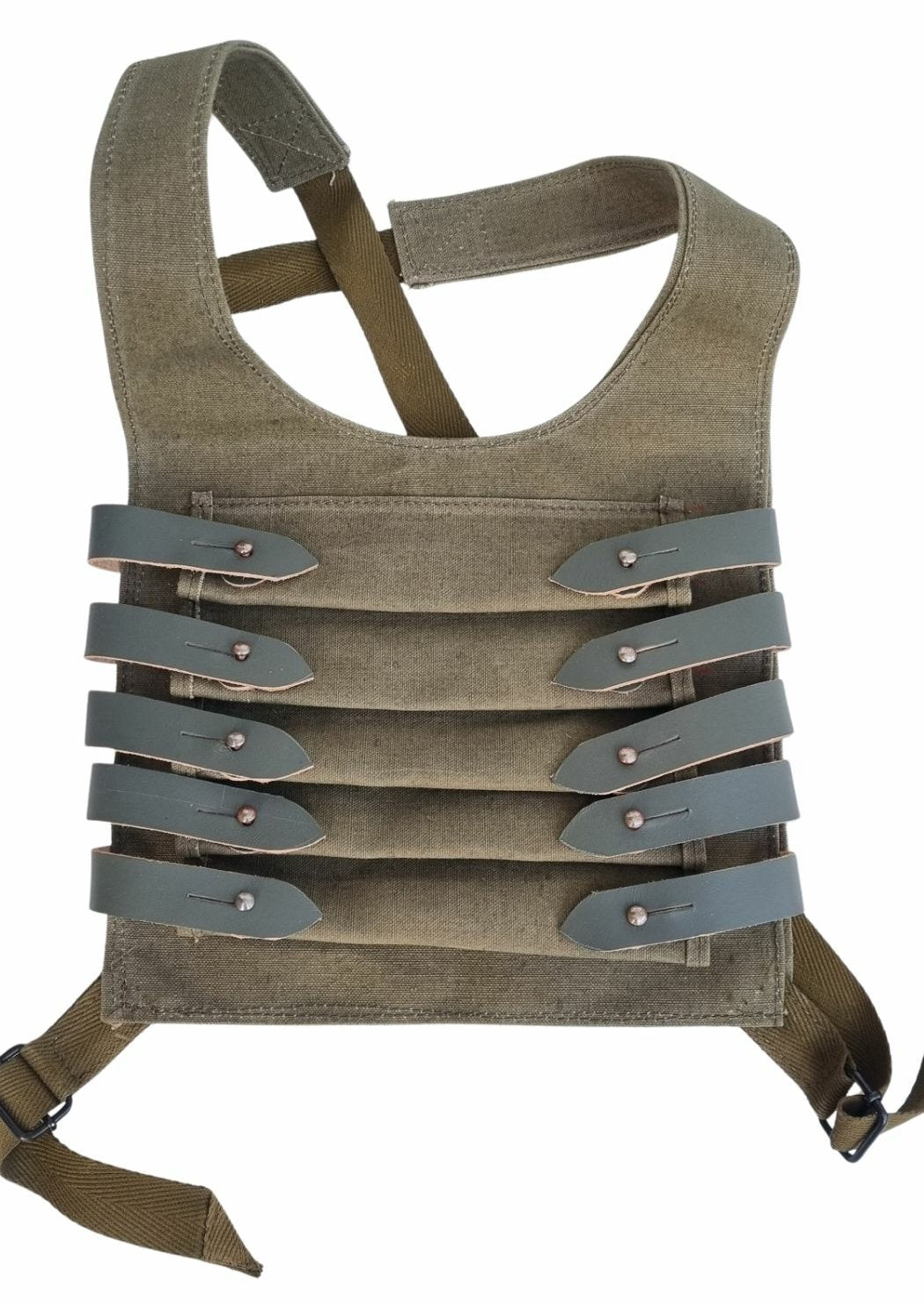 Realizzato come da originale depoca, riproduce nei dettagli la struttura porta caricatori e lassetto delle tasche munizioni, con tessuto e rifiniture tipiche del periodo, offrendo un prodotto funzionale e visivamente aderente agli esempi storici.