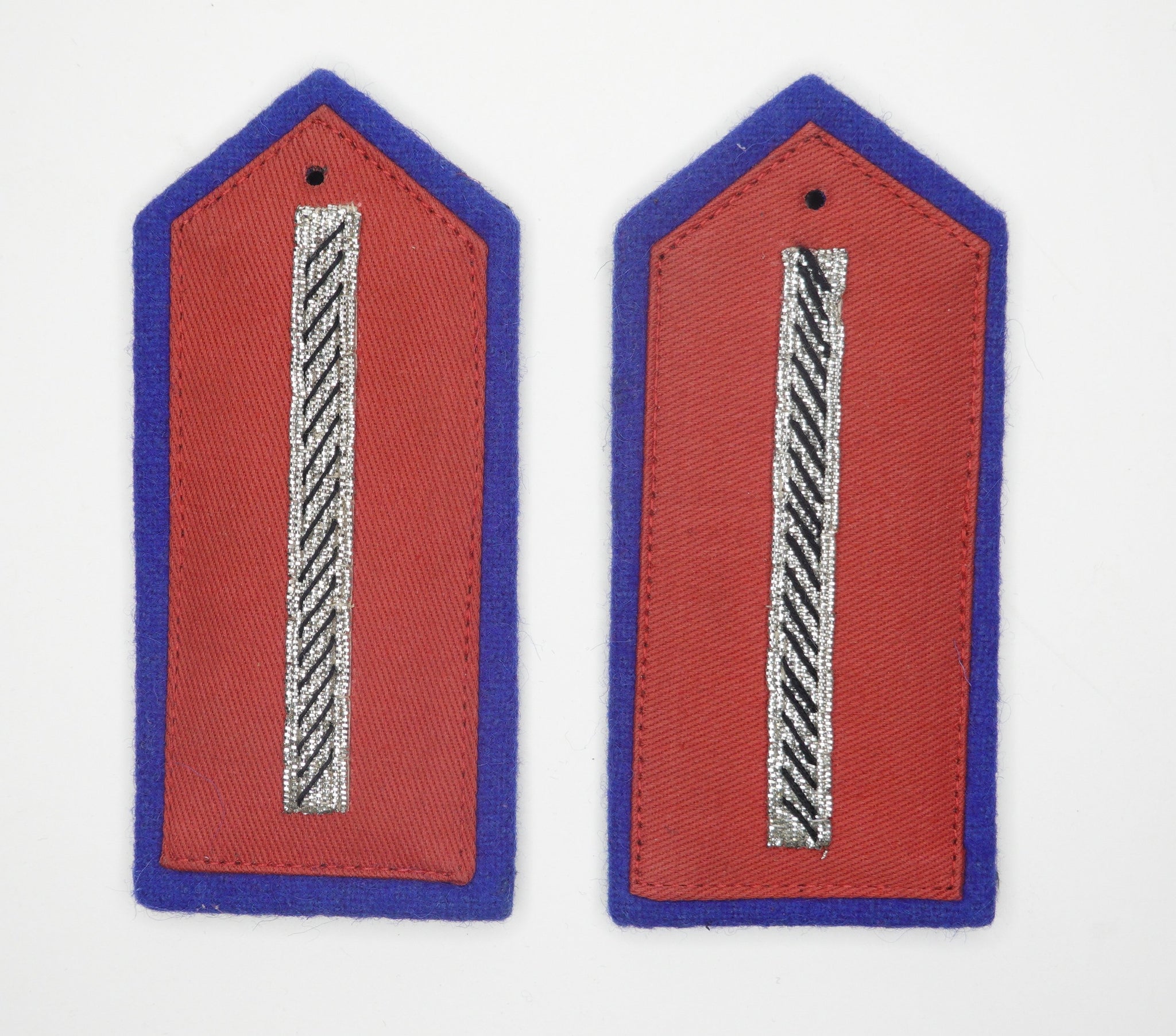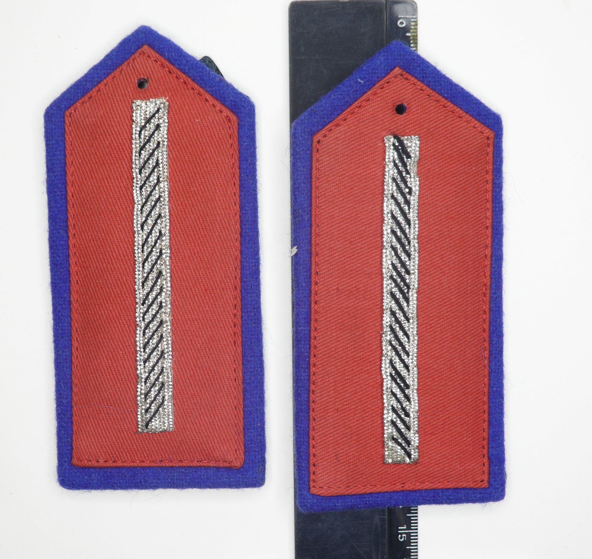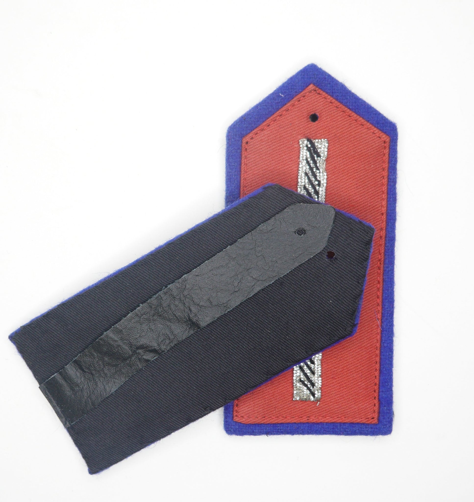 Realizzate artigianalmente su panno rosso con bordatura in azzurro Savoia, fedeli agli originali depoca. Il gallone di grado è in canottiglia oro con le caratteristiche striature nere, segno distintivo del grado di Maresciallo Coloniale.