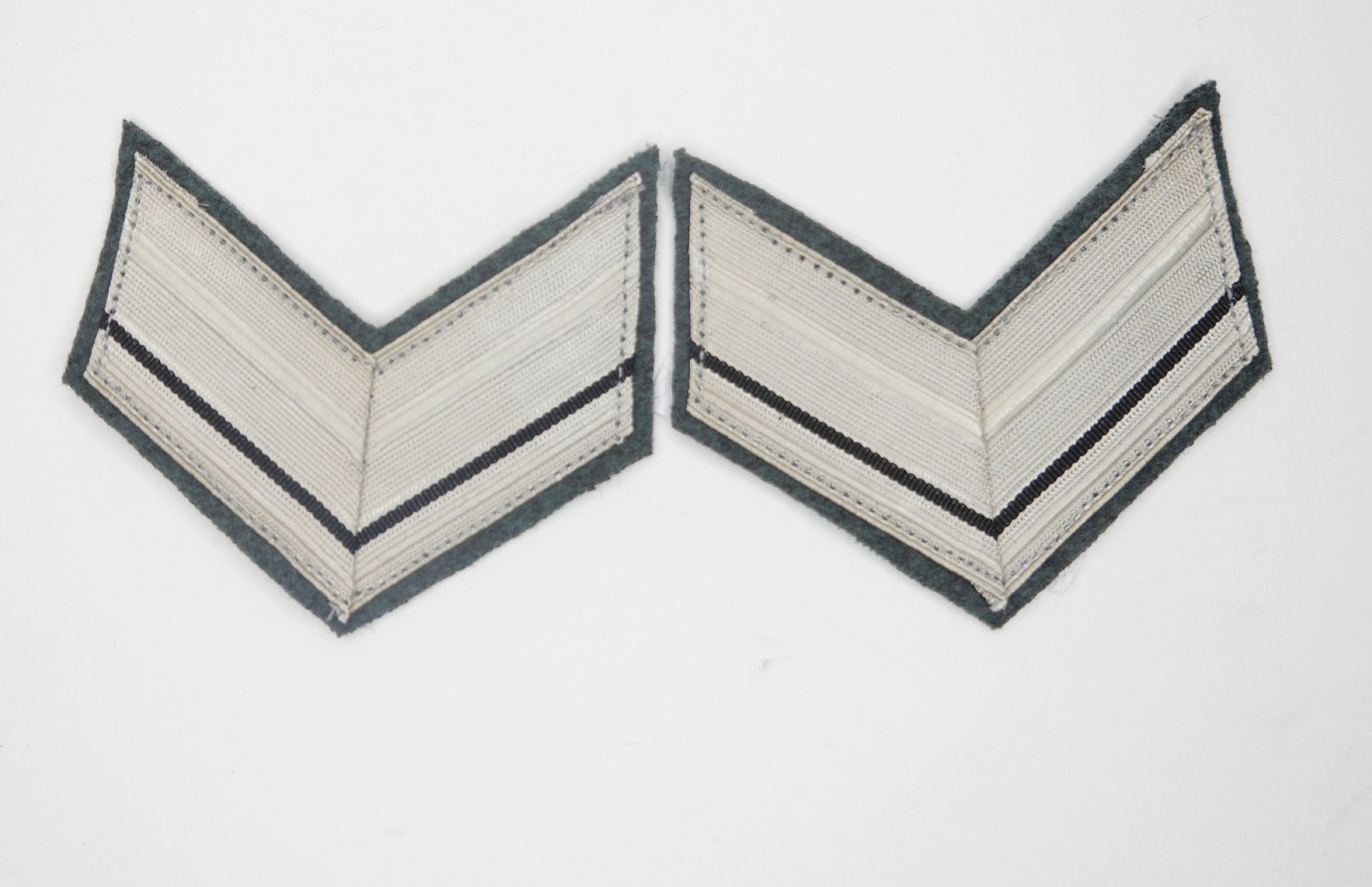Realizzati artigianalmente in gallone argentato con due righe nera, applicato a V normale su sotto panno in panno grigioverde, come previsto dai regolamenti del Regio Esercito Italiano.